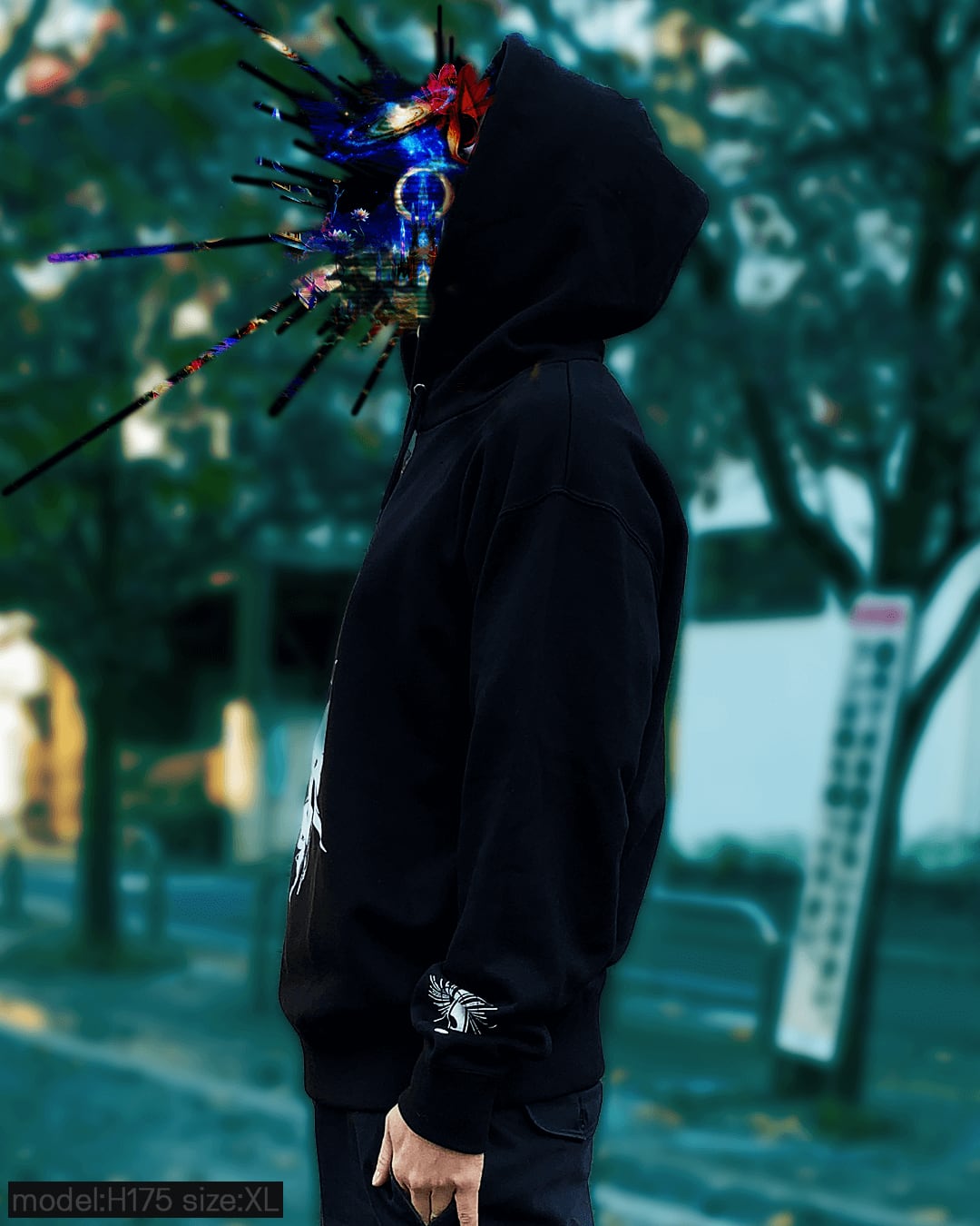 ポケットレスパーカーを採用することで、前面への諸行無常グラフィティをビッグプリントにて実現。